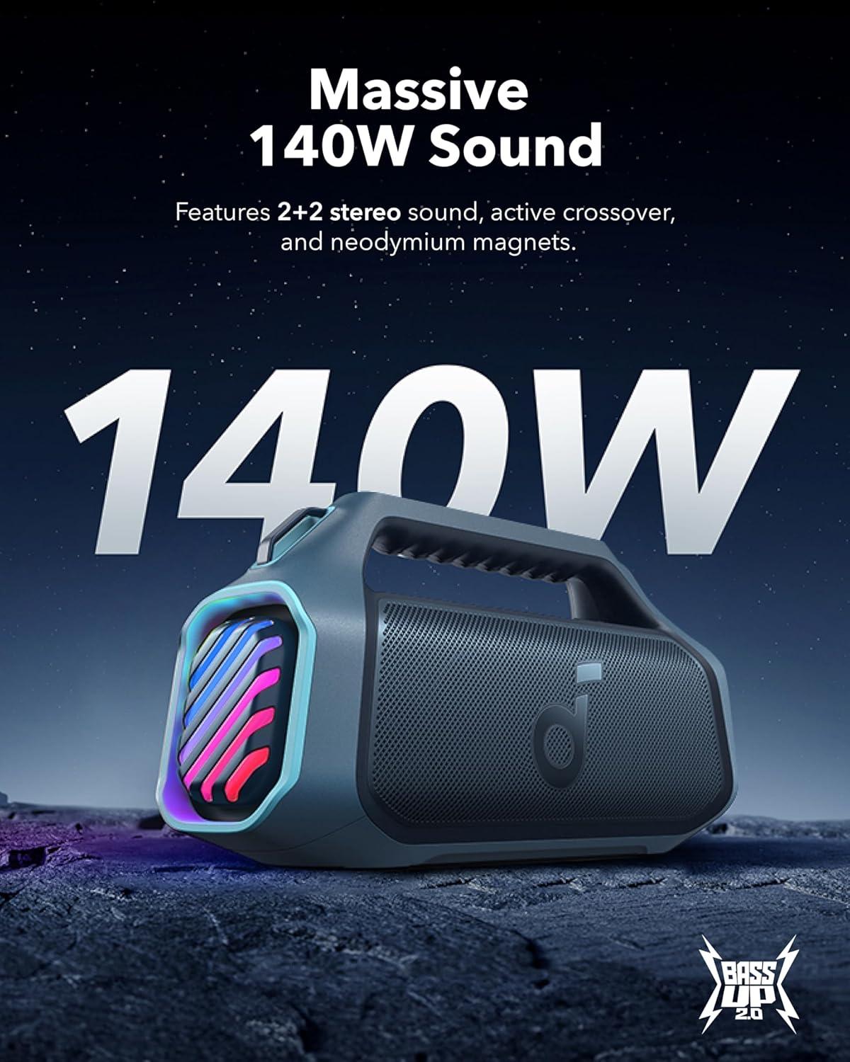 soundcore Boom 2 Plus By Anker, Outdoor Speaker, 140W, 2+2 Channel, BassUp 2.0, 20H Playtime, Fast Charge, IPX7 Waterproof, RGB Lights, Power Bank, Bluetooth 5.3, Portable for Outdoors, Camping, Beach(Blue)