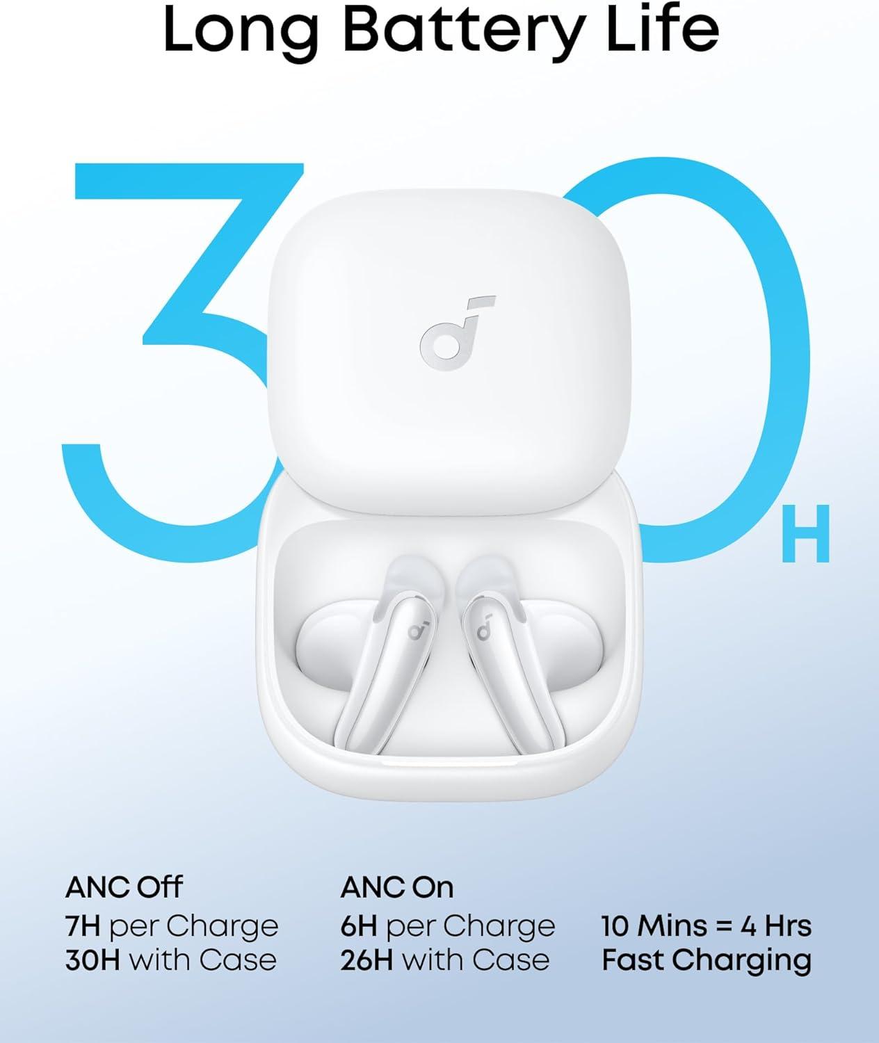 Long Battery Life: Standard Mode: Get up to 7 hours of playback on a single charge, and a total of 30 hours with the charging case. ANC On: Enjoy up to 6 hours of listening on a single charge, and up to 26 hours with the charging case.