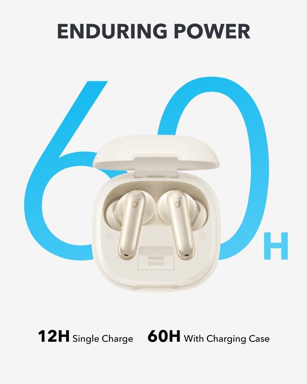 imageSoundcore P40i by Anker Noise Cancelling Wireless Earbuds Adaptive Noise Cancelling to Environments Heavy Bass 60H Playtime 2in1 Case and Phone Stand IPX5 Wireless Charging Bluetooth 53Oat White